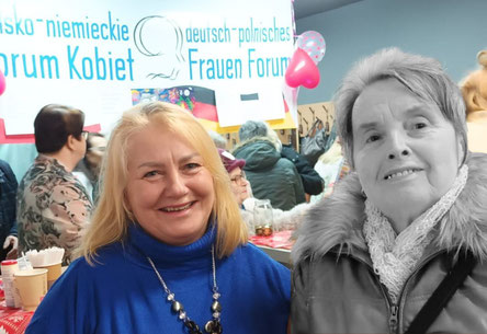 Unsere Vorsitzenden Teresa und Ulla am 29. Januar 2023 vor dem Kuchenstand des Frauen-Forums, an dem zum 31. Finale der jährlichen Benefizaktion "Großes Orchester der Weihnachtshilfe" (WOŚP) in Swinemünde viele selbstgebackene und gesponserte Kuchen für einen guten Zweck verkauft wurden. Ein Dankeschön geht u.a. an die Casa Familia Familienferienstätte Zinnowitz für den gespendeten Kuchen und an die vielen fleißigen Mitglieder für ihre rege Unterstützung! 😀😍
